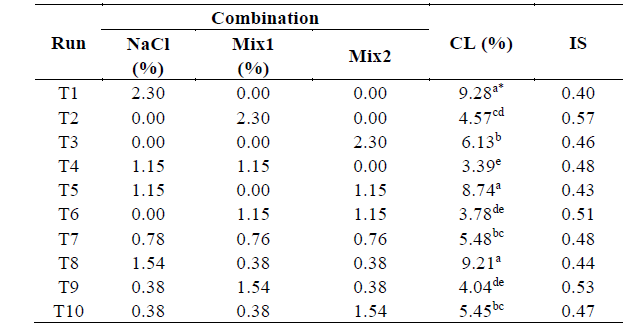 Table 2: Cooking losses (CL) and ionic strength (IS) of standard frankfurter sausages made with different combinations of NaCl.