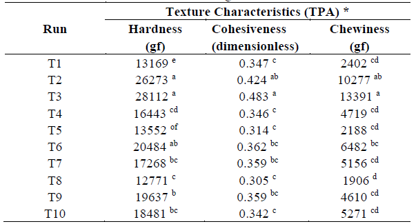 In Table 3, results of the texture profile analysis, related through hardness, cohesiveness and chewiness, are shown for the 10 treatments of standard frankfurter sausages. Using these data, the response surface and ANOVA values were obtained for each texture descriptor.