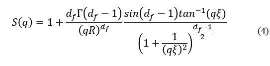 First at all, a mass-fractal structure factor was used in order to fit the complete experimental SAXS data. The mass-fractal structure factor assumes that the lower q-values scattering pattern can be modelled using a power law, so that, the exponent represents the fractal dimension, this range of values is limited by finite cluster size (ξ) and by the primary particle size (R), by means of an exponential cut-off pair correlation function