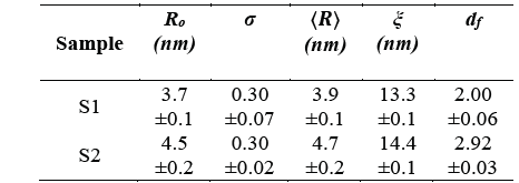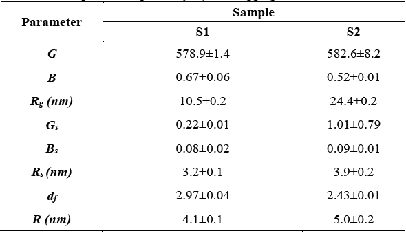 Table 2: Fitting parameters for samples S1 and S2 using the sphere form factor and mass Fractal structure factor. R