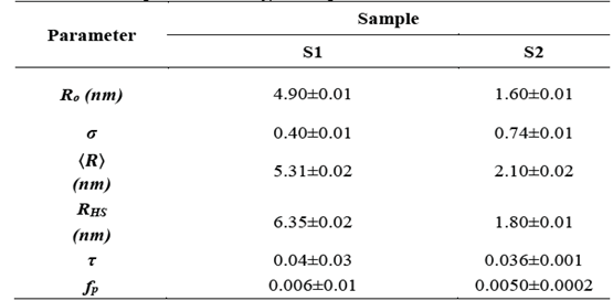 Table 3 : Fitting parameters for samples S1 and S2 using the using the sphere form factor and mass hard sphere structure factor. R