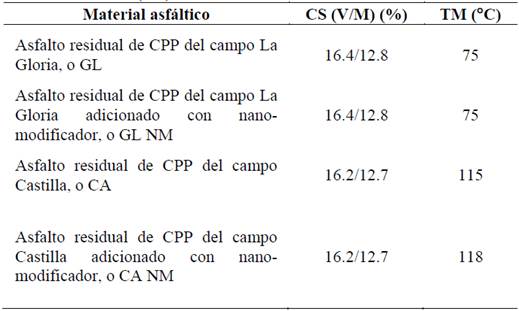 El nano-modificador utilizado tiene como base organosilanos a escala nanométrica y según recomendaciones del fabricante fue adicionado al 0.0625% por masa de AR. La adición directa del nano-modificador al CPP, para luego obtener por destilación el AR nano-modificado se descartó luego de observar que durante el proceso de destilación atmosférica a 360 (C se destila parcialmente el nano-modificador. Lo anterior impide controlar la proporción final de modificador incorporada al AR. Dado lo anterior: (i) la mezcla de AR y nano-modificador se llevó a cabo directamente sobre el AR-a las temperaturas de mezclado indicadas en la Tabla 1-y (ii) el contenido de solventes reportado para los AR CA y CA NM son iguales (i.e., 16.2%), así como para los AR GL y GL NM (i.e., 16.4%).