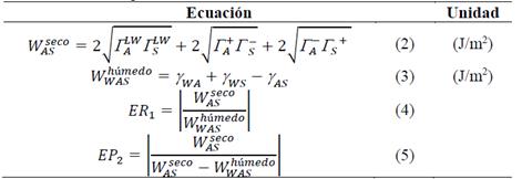 , índice [19], e índice EP2 [20]. Estos parámetros se derivan de las componentes de ESL del ligante asfáltico-y másticos-(subíndice A), agregados (subíndice S), y del agua (subíndice W).