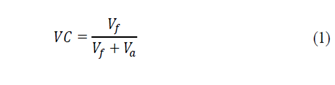 El proceso de mezclado del llenante mineral y los productos asfálticos también se realizó a las temperaturas de mezclado indicadas en la Tabla 1. El llenante mineral se precalentó por un mínimo de 6 horas y luego, el mezclado con el producto asfáltico se llevó a cabo a 1000 rpm por 15 minutos sobre placa calentadora para garantizar temperatura constante (i.e., durante los 10 minutos iniciales se adicionó el llenante mineral y los últimos 5 minutos permitieron la homogeneización del mástico). Los másticos fueron dosificados por concentración volumétrica de llenante mineral, VC; estas concentraciones fueron calculadas según la ec. (1), en función de los volúmenes de llenante mineral, V f , y ligante asfáltico, V a .