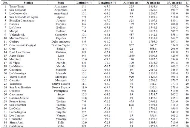 Venezuela is located in the inter-tropical zone from 0o to 13o latitude North and 59o to 54o longitude West. This country has an interesting variety of climates, namely, tropical rainforest, tropical savanna, tundra, desert, steppes, and so on. In this work, monthly precipitation rate measurements made along 30 years in 35 of the Venezuela’s meteorological stations is used for generating rain rate contour maps of the country to generate rain rate contour maps of the country. The measurements were supplied by the Instituto Nacional de Meteorología e Hidrología (INAMEH) [23] and initially explored by Rujano-Molina et al. [10]. Table 1 summarizes the information about the stations.