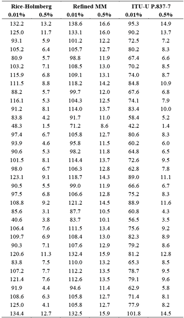 Table 2 shows rain rates converted to 1-min integration time for exceedance probability 0.01% (input parameter considered in various rain attenuation models) and 0.5% (a typical percentage in planning of satellite communication operating at frequencies above 10 GHz), using RH and RMM models and Recommendation ITU-R P.837-7 Annex 1.