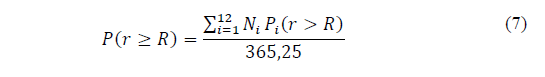 In Eq. (7), P i (r ≥ R) corresponds to the monthly CCDF of rain rate for the ith month, defined as