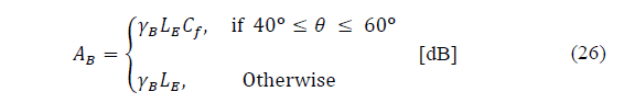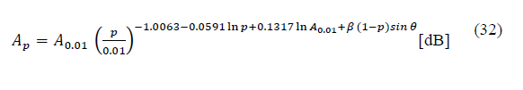 Ramachandran-Kumar (RK) model was developed on rain attenuation measurements performed on Ku-band satellite in Fiji, a tropical region [3]. The model considers the existence of a breakpoint, related to a change in rain structure, in the decrease of complementary cumulative distribution (CCD) of precipitation rate and shows two adjusted expressions of Recommendation ITU-R P.618-8 (published in 2003): one for lower rainfall rates at the breakpoint and another one for higher rainfall rates. According to the model, rain rate breakpoint takes place in a exceedance probability of time, p R , approximately equal to 0.01%, while for attenuation, the percentage of time, p A , in which the breakpoint occurs, is 2.14 times higher than p R . Therefore, the attenuation, A 0.01 , of original ITU-R model, becomes A B , that is the attenuation exceeded for 0.021% of time, calculated by the original version. In general, rainfall attenuation given by RK model includes an expression for (0.021 ≤ p <1) that incorporates a correction factor, C f , for link elevation angle, θ, between 40o and 60o (consider crossed slant path with more than one cell), and another expression used to estimate rain attenuation for p ≤ 0.021.