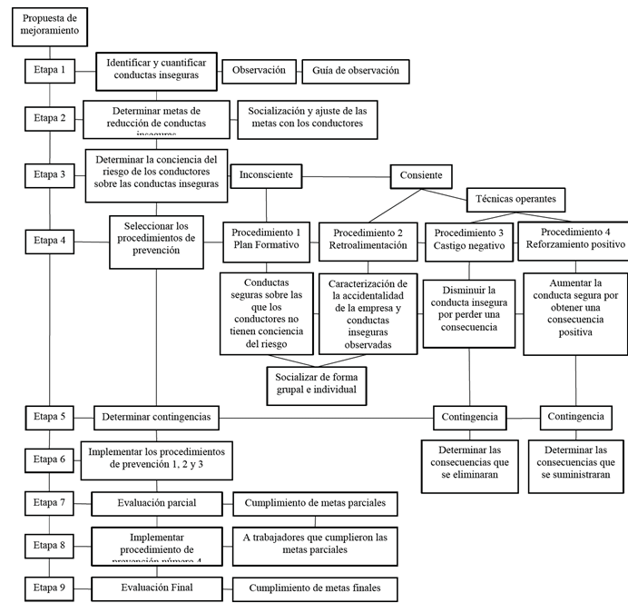 Debido a la alta conciencia del riesgo que se encontró en los conductores sobre las conductas inseguras que realizan, los procedimientos de prevención que se plantean en esta propuesta están orientados principalmente hacia la implementación de las técnicas operantes y la retroalimentación. De las técnicas operantes se propone utilizar el reforzamiento positivo y castigo negativo debido a que se complementan y se ha demostrado su efectividad, excluyéndose el reforzamiento negativo y el castigo positivo por los efectos negativos que pueden resultar de los estímulos aversivos que deben suministrase. Por último se propone implementar un plan formativo dirigido solamente hacia las conductas inseguras sobre las cuales los conductores no demostraron tener una alta conciencia del riesgo.