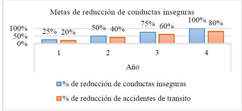 Se propone una reducción del 100% de las conductas inseguras en un plazo de cuatro años, con una reducción anual del 25% y revisiones de cumplimiento trimestrales de cada conducta insegura. Esta reducción se plantea de acuerdo con los resultados de otros estudios en los que estos procesos de seguridad basados en los comportamientos reportaron reducciones de conductas inseguras entre un 25 y 100 % [10]. Como consecuencia de la reducción de estas conductas inseguras se espera una reducción hasta del 80% de los accidentes de tránsito, lo que significa reducir de 87 a 17 los accidentes que se presentan en promedio cada año, esta proyección se plantea teniendo en cuenta los resultados de correlación entre las conductas inseguras y los accidentes de tránsito [7].