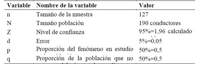 Se calculó una muestra probabilística de 127 conductores, utilizando la Ecuación (1) para estudios descriptivos con población finita y variables discretas [15]; las variables de la Ecuación (1) se describen en la Tabla 1.