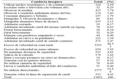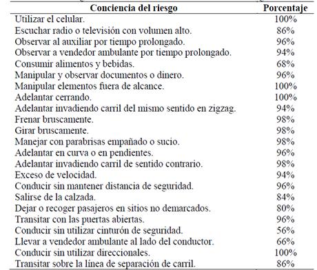 Por otra parte en algunas conductas inseguras como transitar sobre la línea de separación de carril, llevar a vendedor ambulante al lado del conductor, conducir sin utilizar cinturón de seguridad, dejar o recoger pasajeros en sitios no demarcados, salirse de la calzada, consumir alimentos y bebidas y escuchar radio o televisión con volumen alto, se observa que entre el 56 y el 86% de los conductores son conscientes del riesgo.