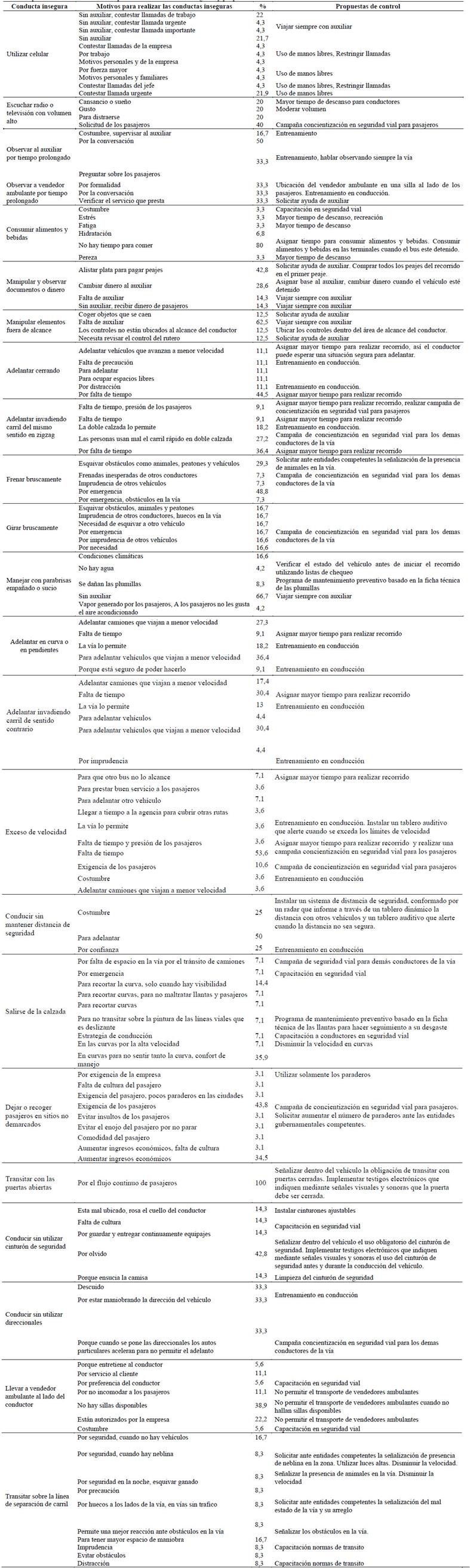 En la Tabla 5 se presentan los motivos que llevaron a los conductores a realizar conductas inseguras y los controles que se proponen.