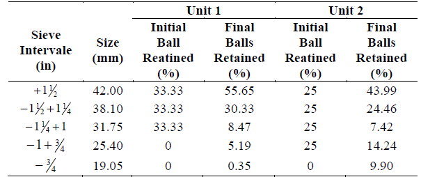 It was determined that, in the unloading process, the sieved ball percentage that uses a bigger mesh was around 55% of unit 1. In addition, it can be seen that current balls retained is greater than the initial one in the size interval between 38.10 mm and 42.00 mm mesh, due to the fact that once the grinding process started, the mill was recharged only with 42 mm balls (the biggest ones), while in the other meshes the current balls retained is smaller than the initial one. This fact suggests that this particular mill could be recharged in the grinding process with balls of different sizes, leading to optimal grinding conditions. The percentages of sieved balls in the two smaller meshes are due to the fact that the small balls are worn.
