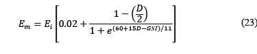 Donde Ei es el módulo de deformación de la roca intacta, GSI es el parámetro de la clasificación de Hoek-Brown y D es el parámetro de perturbación por voladuras.