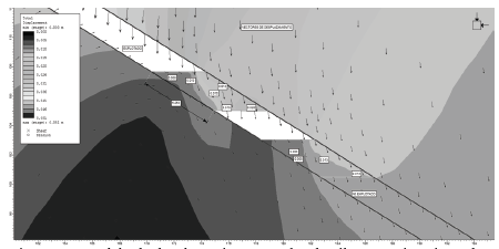 Figura 18: Modelo de desplazamientos totales de pilar y macizo circundante con explotación del panel superior e inferior.