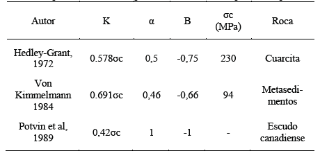 donde Rp es la resistencia del pilar, K, α, β son constantes empíricas, W es el ancho del pilar y H es la altura del pilar. En la Tabla 1 se presentan propuestas de este tipo, σc es la resistencia a la compresión uniaxial de la roca intacta.