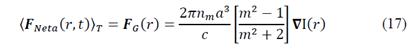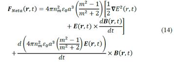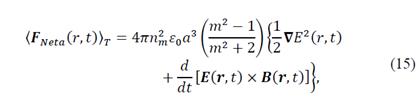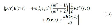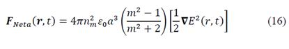 Where n m is the refractive index of the medium, Є0 is the electric permittivity of vacuum, α is the radius of sphere, m=n p /n m is the refractive index of the sphere (n m ) relative to environment (n m ) and E(r,t) is the electric field of the incident radiation. The first force considering is a consequence of the interaction of the electric and magnetic fields of the light beam on the sphere and is exactly the Lorentz's force.