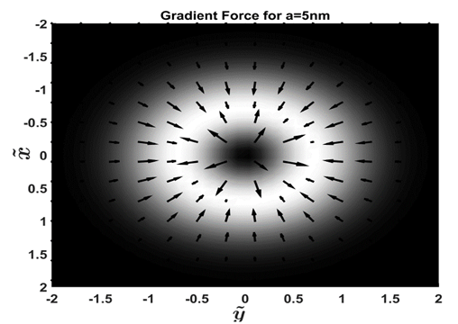 The behavior of the transverse component and of the Gradient Force will be the same that in the component x, as is possible to observe in the equations (5) and (6), because of symmetry. In Fig. 2 it is possible to obtain a view in the transverse plane xy, where the origin of each arrow indicates the position of the sphere, the length of the arrow represents the magnitude of the Gradient force and the direction of the arrow represents the direction of the force respectively. In order to facilitate the analysis, the intensity of the beam has been recorded in the same figure and where it is possible to corroborate the previous restorative behavior in Fig. 1 of the transverse components of the Gradient force. In other words, a potential well is generated in the region of greater intensity of the beam.
