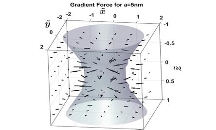 A qualitative analysis of the behavior of the Gradient force in the 3D space, can obtained in Fig. 6. In this figure, the hollow hyperboloid represent the zones of greater intensity of the mode TEM*01. Is possible evident the restorative nature of the Gradient force, at to regions of greater intensity. Nevertheless, is possible to observe that arrows that represent at the Gradient force only have components in the plane xy. This is because of that transverse components in x and y(Fig.1), are of order 10-7 while the longitudinal component z, is of order 10-10 (Fig. 5), and therefore, thousand times smaller than the transverse component.
