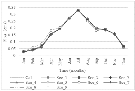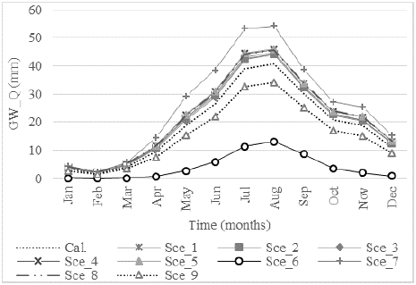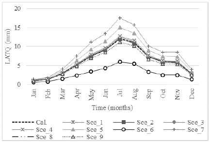 The behavior of the flow in scenarios 6 and 9 is closely related to the real evapotranspiration variable, since this is lower than that obtained in the other scenarios in the months of January to July, increasing from August to December, as can be seen in Fig. 5, with more rainfall available in the soil to contribute to the flow in the first semester of the year and lower in the second semester.