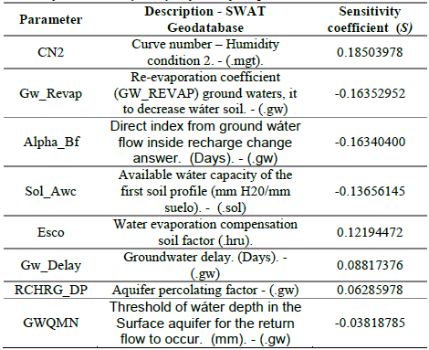 Within the results it was identified that of the 21 parameters analyzed the most sensitive corresponds to the Curve Number CN2 that is part of the runoff processes, followed by the re-evaporation coefficient - Gw_Revap. It is also observed that 3 parameters do not cause change to the output of the model, such as the threshold depth of water in the shallow aquifer to produce Revap - Revapmn, the delay time of surface runoff - Surlag and the temperature gradient - Tlaps, with S values equal to zero.