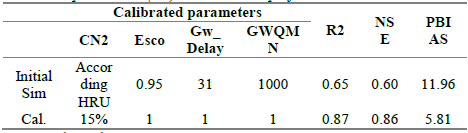 Calibration is the process by which the simulated and observed values are optimally adjusted, focusing on minimizing the differences between these data [16]. It was made manually through the analysis "Error Test" to the parameters that were most sensitive, with the purpose of obtaining a good or very good statistical performance according to Moriasi, D. N., et al (2007) [17], for Nash-Sutcliffe (very good 0.75≤NSE≤1.00, good 0.65≤NSE≤0.75, satisfactory 0.50≤NSE≤0.65 and unsatisfactory NSE≤0.50) and PBIAS (very good PBIAS≤ ± 10, good ± 10 ≤PBIAS≤ ± 15, satisfactory ± 15≤PBIAS≤ ± 25 and unsatisfactory PBIAS≥ ± 25), in addition, the coefficient of determination R2 was calculated.
