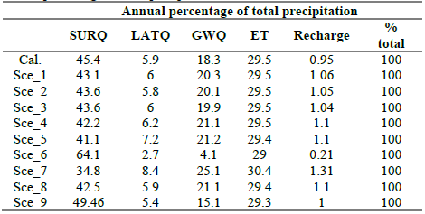 Table 5: Summary hydrological behavior obtained in the sub-basin Los Pozos in annual percentage of total precipitation.