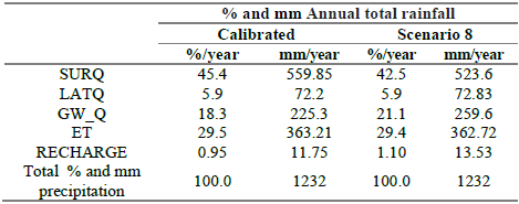 From Table 6 it is concluded that when implementing scenario 8 compared to the current situation, the hydrological behavior of the sub-basin would be: