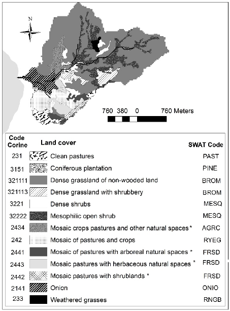 Soil use information was obtained from the land cover map at scale 1: 25,000 from paramo from the Lago de Tota basin, crafted under the Corine Land Cover methodology adapted for Colombia -CLCC, in year 2014 by the IDEAM (Instituto de Hidrología, Meteorología, y Estudios Ambientales), completed with the land uses observed in the lower part of the subbasin. Identifying 13 plant covers, which were classified within the types that the SWAT manages through bibliographic review [7,10,11,12], Fig.1. Coverages marked with (*) are more detailed levels that were defined in the scale 1: 25,000.