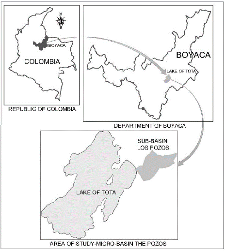 The study was conducted in the sub-basin Los Pozos, located in the Lago de Tota basin, municipality of Aquitania, Boyacá's department, Fig. 2. With a drainage area of 601.74 ha (according to study), its main channel is the Quebrada Los Pozos.