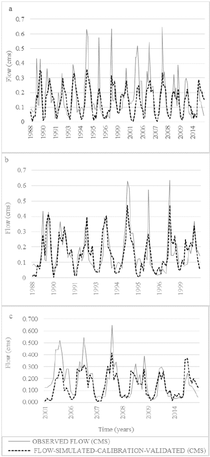 Figure 3: a. Flow observed v/s simulated initially. b. Monthly flow observed v/s calibrated flow. c. Monthly flow observed v/s validated flow.