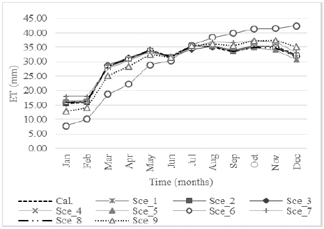 Figure 5: Comparison between actual evapotranspiration obtained in the calibration and in the scenarios.