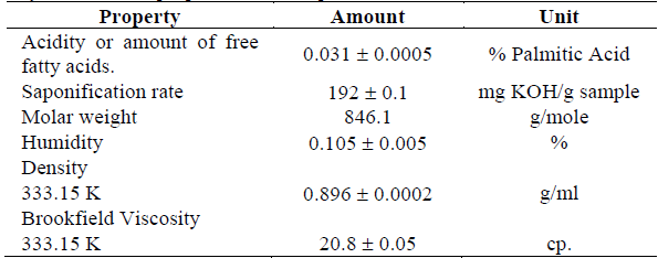 Palm oil was obtained from Intergrasas Ltda, located in Bogotá - Colombia. Physicochemical properties such as density, humidity, saponification index and acidity (amount of free fatty acids) were evaluated according to the standards NTC 336 [15], NTC 287 [16], NTC 335 [17] and NTC 218 [18], respectively. In addition, the viscosity was measured using a viscometer (Brookfield RVDV-II + P CP) at 333.15 K and 313.15 K.