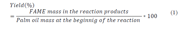 The content of methyl esters in the biodiesel was analyzed with a SHIMADZU G-C 2014 gas chromatograph equipped with a flame ionization detector (FID) and a column forte BP20 - WAX (60 m x 0.25 mm ID x 0.25 μm). The temperature of the column was first established at 403.15 K and increased to 453.15 K with a heating ramp of 15 K/min, (keeping this temperature for 0.5 min) and continued heating to 528.15 K with a heating ramp of 9 K/min. (keeping this temperature for 4 min) for a total time of 16.17 min. The samples to be analyzed were prepared by mixing: 500 μl of the phase rich in esters in hexane HPLC (10 mg / 10 ml), 200 μl of methyl heptadecanoate solution in hexane HPLC (10 mg / 10 ml) and 800 μl of hexane HPLC, to complete a volume of 1.5 ml. The amount of methyl esters produced (FAME yield % wt/wt) was calculated according to the equation reported by Suryaputra, Winata, Indraswati, and Ismadji [21] and Naureen, Tariq, Yusoff, Chowdhury and Ashraf [22] (Equation 1).