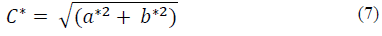 Where α* represents chromatic coordinate red/green and b* is the chromatic coordinate blue/yellow.