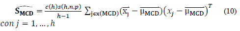 de tamaño h, seguidamente se calculó el determinante de cada una de las matrices obtenidas en el paso anterior y finalmente se eligió la sub-muestra con la que obtuvo el determinante más bajo en la matriz de covarianza para así calcular el estimador de la matriz de covarianza mediante la ec. (10):
