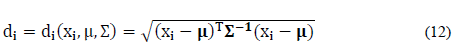 La distancia de Mahalanobis permite detectar datos atípicos multivariantes, a partir de la descripción de la distancia entre cada punto de datos y del centro de masa de los mismos. Cuando un punto se encuentra distante del centro de masa, se considera como un valor atípico [15] [12], el cálculo de esta distancia se realizó mediante la ec. (12).