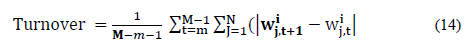 En el índice de turnover de estabilidad calculado bajo enfoque de rolling horizon, se utilizó como indicador de la dinámica constante de los pesos asignados a los activos de la cartera en cada rebalanceo; para lo cual se utilizó la siguiente ec.(14) que también es porpuesto en [5]