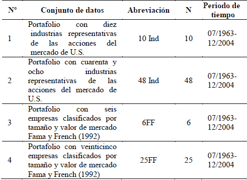 Los datos que se utilizaron se encuentran disponibles en el portal web de Kenneth R. French [7], donde se proporciona las rentabilidades históricas diarias, mensuales, y anuales de diferentes carteras conformadas por acciones pertenecientes a las bolsas de valores NASDAK, NYSE y AMEX de Estados Unidos. Para este estudio se seleccionaron carteras con rentabilidades históricas mensuales dado que son las que se utilizaron en el estudio de referencia.