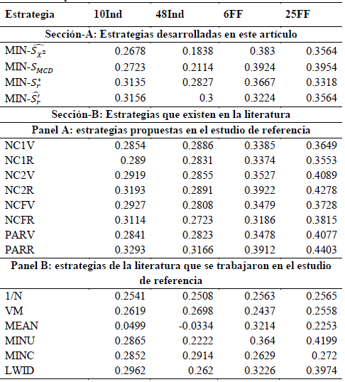 Se observa en la Tabla 4, que en términos del ratio de sharpe los métodos estudiados en este artículo, que la estimación de las matrices de covarianza para la selección de portafolios superan notablemente el panel B de la sección-B, en especial los valores del ratio de sharpe de los portafolios de mínima varianza de dimensión 10Ind, 48Ind, 6FF y 25FF obtenidos con el método encogimiento de la matriz de covarianza con recorte a la media.