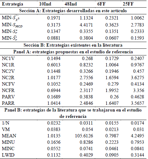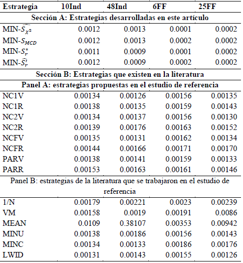 los portafolios supereraron en promedio el 100% las varianzas del panel A y del panel B de los portafolios de la sección-B, mientras que con el empleo de la estrategia MCD, las estrategias estudiadas en este artículo superaron en promedio del panel A el 12.5% y del panel el 100%.