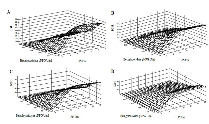 Figure 6. : Response surface of the GHI against the cellulitic activity FPU / ml and beta-glucosidase activity pNPG U / ml, for the substrate S3 (A), S5 (B), S6 (C) and S8 (D) with a hemicellulase activity 60 IU / ml.