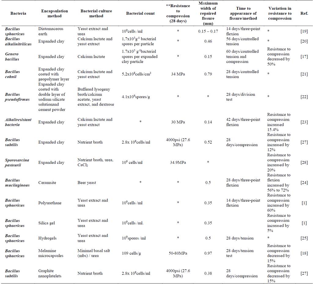 Previous studies have investigated bacterial species such as Bacillus sphaericus, Sporosarcinapasteurii and Bacillus subtilis [15], as well as aspects of encapsulation methods (size, material), nutrient type, and number of capsules required for the efficient repair of fissures. This review focuses on encapsulation techniques, including diatomaceous earth, lightweight aggregates (expanded clay), ceramsite, silica gel, hydrogel, polyurethane, graphite, metakaolin, among others. Encapsulation is one of the main factors affecting the compressive strength of concrete [14,16-18], asreviewed in the following.