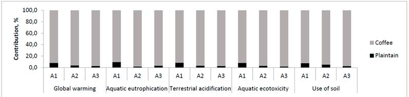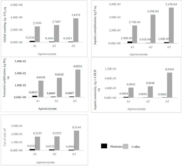 For both plantain and coffee crops, the stages that contributed the most to environmental burdens were establishment and production, mainly due to the manufacture and use of fertilizers. In plantain specifically, A1 agroecosystem (low productivity) was the one that caused the greatest impact due to the inadequate environmental and agricultural practices. The values presented for the establishment were: 9,02E-02 kg CO2, 2,18E-05 kg P eq, 5,98E-04 kg SO2 eq, 2,13E-04 kg 1,4 DCB eq, and 5,79E-03 m2, and for production:1,34E-01 CO2, 7,26E-06 kg P eq, 6,54E-04 kg SO2 eq, 1,55E-04 kg 1,4 DCB eq, and 1,23E-02 m2 in global warming, aquatic eutrophication, terrestrial acidification, aquatic ecotoxicity and soil use impact categories respectively. In the case of coffee, agroecosystem A3 (high productivity) contributed the most to the environmental burdens. Thus, at establishment stage, values of 9,99E-01 CO2, 2,37E-04 kg P eq, 0,0085 kg SO2 eq, 6,86E-03 kg 1,4 DCB eq, and 5,04E-02 m2 were obtained, and in the production stage values of 2,64E+00 CO2, 2,05E-04 kg P eq, 0,0135 kg SO2 eq, 3,48E-03 kg 1,4 DCB eq, and 2,52E-01 m2. In global warming, aquatic eutrophication, terrestrial acidification, aquatic ecotoxicity and land use impact categories respectively.