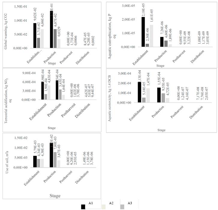 In the case of agroecosystems of medium and high productivity, A2 and A3 respectively, an inverse behavior is observed, that is to say, a lower impact is evident at establishment stage for A3, and greater at production stage for A2, which causes a compensation in global impacts and these are similar for these two agroecosystems (Fig. 4).