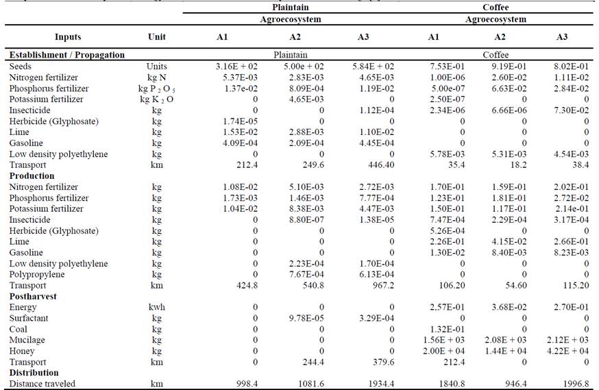 The inputs chosen for each crop and stage are presented for each agroecosystem in Table 2. For agroecosystems in associated crops it is recommended an independent agronomic management for each one in order to reduce potential competences and obtain additional income without affecting any of them [26]. However, in selected agroecosystems, in general for those associated with coffee, the focus is centered in coffee cultivation since it is considered the main product, while plantain receives less rigorous management.