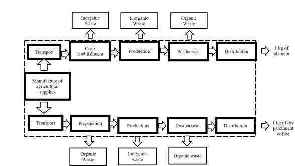 The stages considered for both crops, plantain and coffee were: establishment, production, postharvest and distribution. The following are the considerations taken into account for each of these stages in the respective crops: