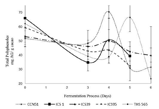 Results of the analysis of variance showed significant differences on day 4 and 5 of the fermentation process (P <0.05). All clones reduced their TP during the first three days of fermentation. After this time, the TP began to increase. Clone CCN51 achieved the highest concentrations on the fourth day and clone TSH 565 reached its highest value on the fifth day; afterwards, both concentrations began to descend. All other clones showed smaller changes. These behaviors can be explained in the initial composition of each material [28,5], but also by the fermentation performance, i.e. initial TP content, pH, total acidity (TA) percentage and temperature profile throughout the fermentation process. These factors influence enzyme activities that are associated with the polyphenol degradation or polymerization [29]. Increase in polyphenols may be due to the formation of polymeric proanthocyanidins (tannins), meanwhile their decrease can be caused by catechin and epicatechin oxidation to quinones.Cocoa polyphenols are important antioxidants [30], and however, their presence is associated to astringency and bitterness in cocoa products.