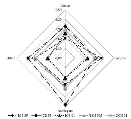 In the case of flavors such as acidity, astringency and bitterness, the most remarkable is the low accentuation of these flavors in the grain [28]. Regarding acidity, a low-medium level was reported. Furthermore, clone CCN 51 was pointed out as the one with the lowest acidity (2.0), meanwhile clone ICS 95 exhibited the highest acidity (4.83).